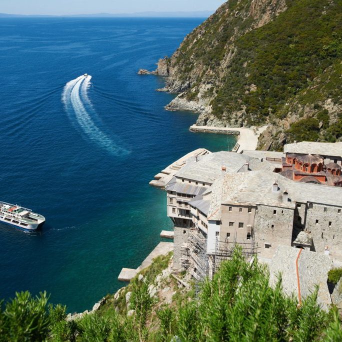 Z portu w Ouranoupoli pożeglujemy wzdłuż wybrzeża Góry Athos podziwiając majestatyczne klasztory i piękno dzikiej przyrody trzeciego palca Chalkidiki.